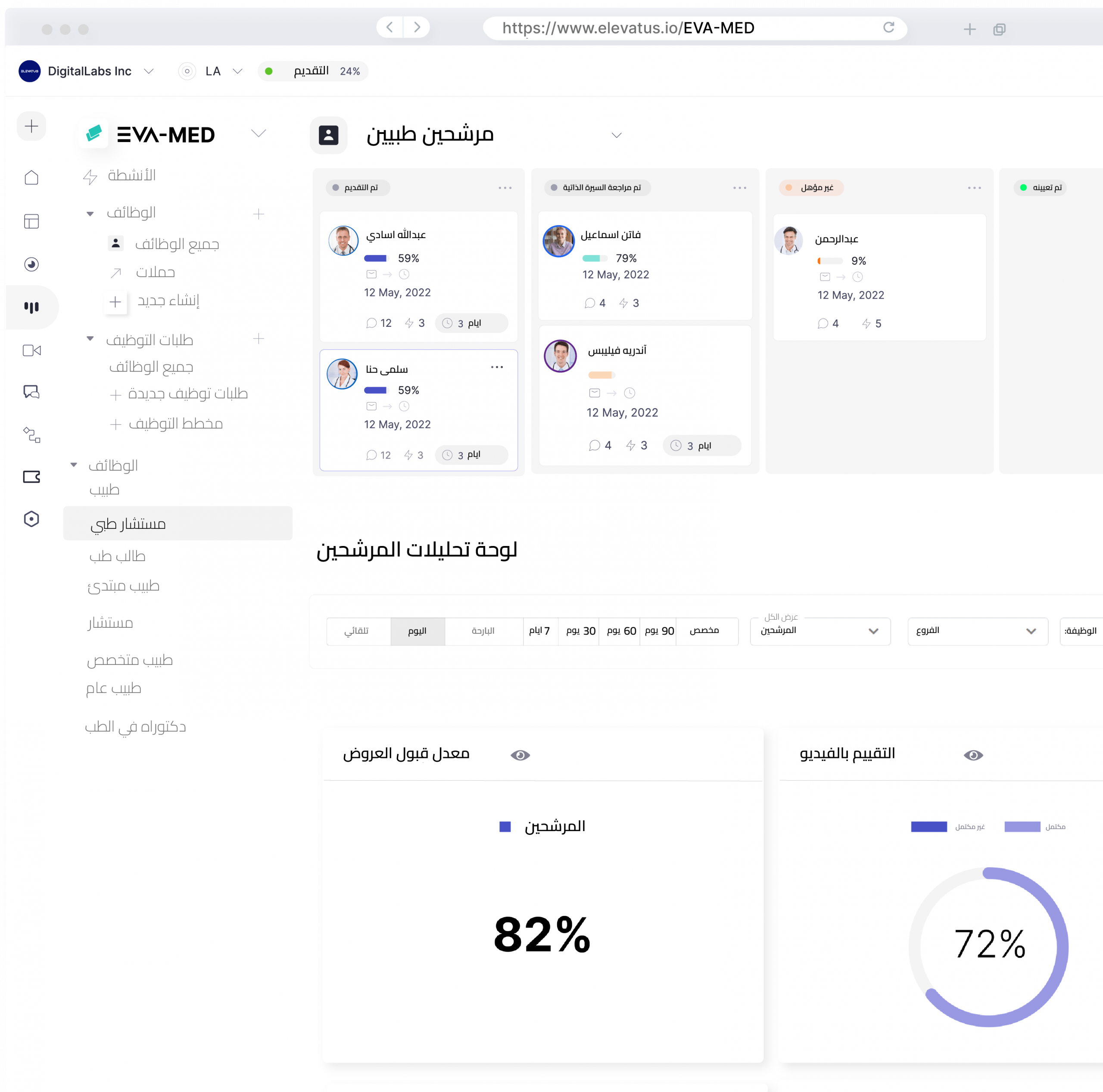 ارفع كفاءة التوظيف في مجال الرعاية الصحية مع EVA-MED من خلال إنشاء مسارات توظيف مخصصة لكل مرحلة من مراحل التوظيف وتتناسب مع المهن الطبية المختلفة مثل الأطباء والمسعفين والممرضين وعبر تكنولوجيا رقمية ذكية.